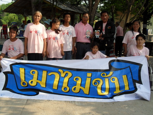 สมาชิกศูนย์ประสานงานเครือข่ายเหยื่อเมาแล้วขับ ในมูลนิธิเมาไม่ขับ จังหวัดสระบุรี รณรงค์ "เมาไม่ขับ" “สงกรานต์นี้ปลอดเหล้า ทำได้ด้วยตัวคุณ” ขอนะ โดยแจกสื่อ สติ๊กเกอร์ แผ่นพับ ผ้าเย็น ให้กับประชาชน ในงานฉลองพระพุทธรูป พระพุทธชินราช ขนาด 69 นิ้ว พร้อมพิธีสงฆ์น้ำพระ ณ วัดกุดนกเปล้า จ.สระบุรี เมื่อวันที่ 15 เมษายน 2554 ที่ผ่านมา