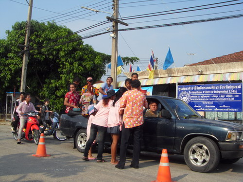 สมาชิกศูนย์ประสานงานเครือข่ายเหยื่อเมาแล้วขับ ในมูลนิธิเมาไม่ขับ จ.ปทุมธานี รณรงค์ "เมาไม่ขับ" “สงกรานต์นี้ปลอดเหล้า ทำได้ด้วยตัวคุณ” ขอนะ โดยแจกสื่อ สติ๊กเกอร์ แผ่นพับ ผ้าเย็น ให้กับผู้ใช้รถใช้ถนน ที่หน้าศูนย์การดำรงชีวิตอิสระ จ.ปทุมธานี เมื่อวันที่ 13 เมษายน 2554 ที่ผ่านมา