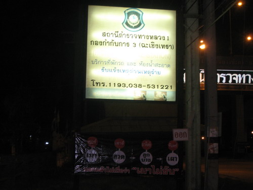 นายกิตชัย กิตติคุณ แกนนำเครือข่ายเหยื่อเมาแล้วขับ ในมูลนิธิเมาไม่ขับ จังหวัดฉะเชิงเทรา ติดแบรนเนอร์”เมาไม่ขับ”หน้ากำแพง ส.ภ.อ.เมืองฉะเชิงเทรา และไปติดแบรนเนอร์”ศุกร์-เมา,เสาร์-สวดฯ”ที่ปากทางเข้าสถานีตำรวจทางหลวงบางปะกง ริมถนนบางนา-ตราด เมื่อวันที่ 11 เมษายน 2551 ที่ผ่านมา