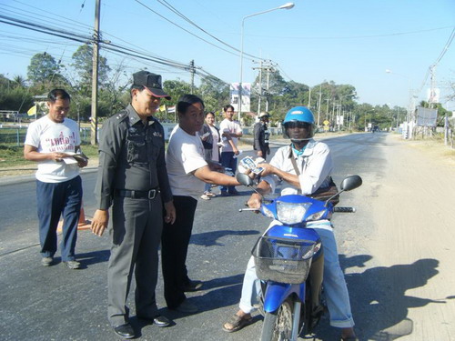 สมาชิกศูนย์ประสานงานเครือข่ายเหยื่อเมาแล้วขับ ในมูลนิธิเมาไม่ขับ จังหวัดสุรินทร์ แจกสื่อ สติ๊กเกอร์ รณรงค์ "เมาไม่ขับ" ให้กับประชาชน ที่ จุดตรวจ ถนนสาย รัตน-อุบลราชธานี เมื่อวันที 31 มกราคม 2554 ที่ผ่านมา