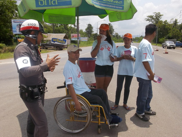 สมาชิกศูนย์ประสานงานเครือข่ายเหยื่อเมาแล้วขับ ในมูลนิธิเมาไม่ขับ จังหวัดตราด รณรงค์ เมาไม่ขับ สงกรานต์ปลอดภัย ตายเป็นศูนย์ แจกสื่อ สติ๊กเกอร์ แผ่นพับ ให้ประชาชนผู้ใช้รถใช้ถนน ณ จุดตราจเนินสูง เมื่อวันที่ 11 เมษายน 2555 ที่ผ่านมา