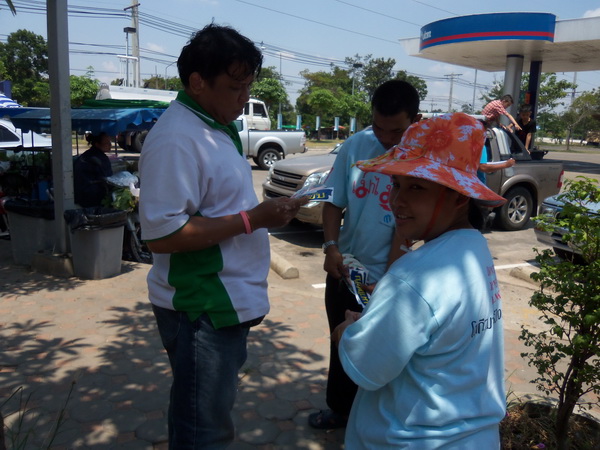สมาชิกศูนย์ประสานงานเครือข่ายเหยื่อเมาแล้วขับ ในมูลนิธิเมาไม่ขับ จ.อุบลราชธานี รณรงค์ เมาไม่ขับ แจกสื่อ สติ๊กเกอร์ แผ่นพับ ให้ประชาชนผู้ใช้รถใช้ถนน ณ ปั้มน้ำมัน ปตท. เมื่อวันที่ 13-15 เมษายน 2555 ที่ผ่านมา