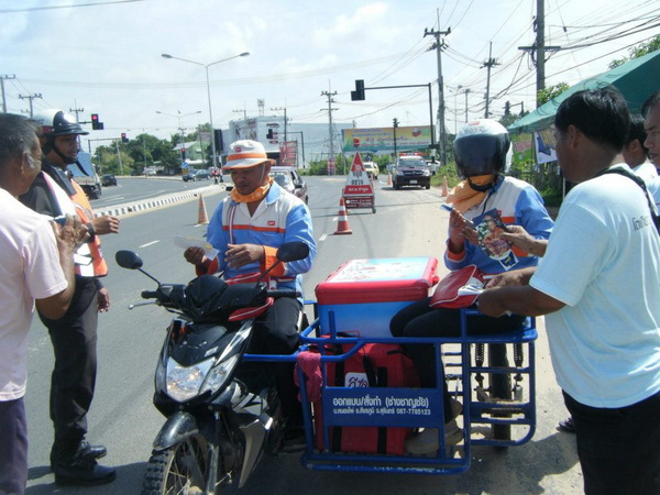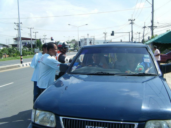 สมาชิกศูนย์ประสานงานเครือข่ายเหยื่อเมาแล้วขับ ในมูลนิธิเมาไม่ขับ จ.สุรินทร์ รณรงค์ "เมาไม่ขับ" แจกสื่อสติ๊กเกอร์ แผ่นพับ ให้ประชาชน ผู้ใช้รถใช้ถนน ณ จุดตรวจ สภ.ท่าตูม เมื่อวันที่ 9 พฤษภาคม 2555 ที่ผ่านมา