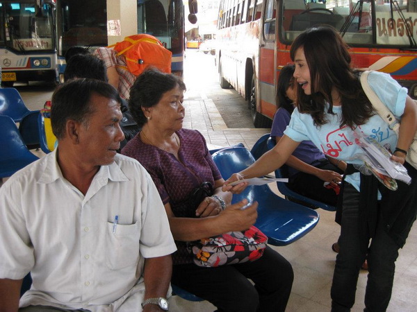 สมาชิกเครือข่ายเหยื่อเมาแล้วขับ ในมูลนิธิเมาไม่ขับ จ.อุทัยธานี รณรงค์ เมาไม่ขับ สงกรานต์ปลอดภัย ตายเป็นศูนย์ แจกสื่อ สติ๊กเกอร์ แผ่นพับ ให้ประชาชนผู้ใช้รถใช้ถนน ณ สถานีขนส่ง เมื่อวันที่ 12 เมษายน 2555 ที่ผ่านมา