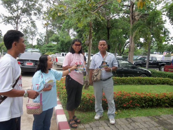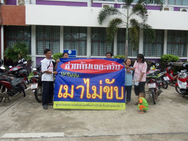 สมาชิกศูนย์ประสานงานเครือข่ายเหยื่อเมาแล้วขับ ในมูลนิธิเมาไม่ขับ จังหวัดอุบลราชธานี รณรงค์ "เมาไม่ขับ" แจกสื่อ สติ๊กเกอร์ แผ่นพับ ให้ประชาชน ในวันที่ 11 มิถุนายน 2555 ที่สถานีขนส่ง จังหวัดอุบลราชธานี
