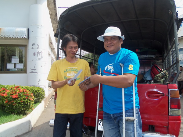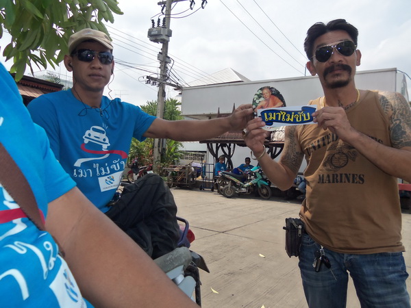 สมาชิกเครือข่ายเหยื่อเมาแล้วขับ ในมูลนิธิเมาไม่ขับ จ.บุรีรัมย์ รณรงค์เมาไม่ขับ สงกรานต์ปลอดภัย ตายเป็นศูนย์ แจกสื่อ สติ๊กเกอร์ แผ่นพับ ให้ประชาชน ณ ปั้มน้ำมัน ปตท. เมื่อวันที่ 12 เมษายน พ.ศ.2556 ที่ผ่านมา