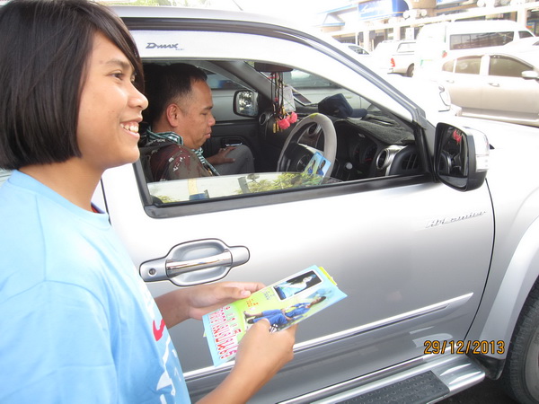 สมาชิกเครือข่ายเหยื่อเมาแล้วขับ จ.สิงห์บุรี รณรงค์เมาไม่ขับ ปีใหม่ตายเป็นศูนย์ แจกสื่อ สติ๊กเกอร์ แผ่นพับ ให้ประชาชน ปั้มน้ำมัน ปตท. ตำบลทับยา เมื่อวันที่ 29 ธันวาคม พ.ศ.2556 ที่ผ่านมา