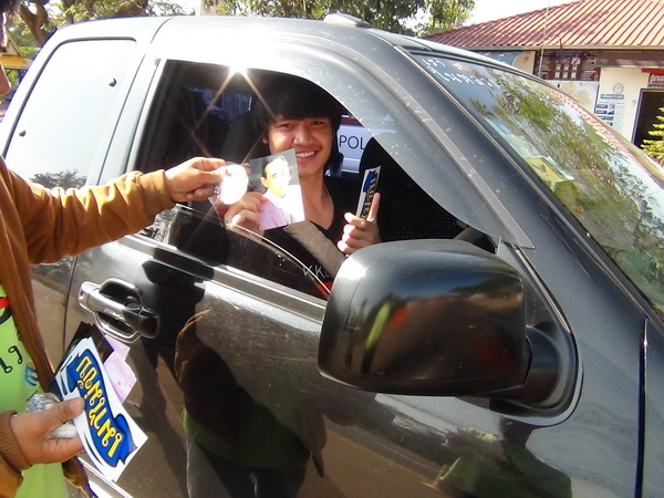 สมาชิกเครือข่ายเหยื่อเมาแล้วขับ จังหวัดมุกดาหาร รณรงค์เมาไม่ขับ ปีใหม่ตายเป็นศูนย์ ร่วมแจกสื่อ สติ๊กเกอร์ แผ่นพับ ให้ประชาชน บริเวณจุดบริการประชาชน สภ.หนองสูง เมื่อวันที่ 30 ธันวาคม พ.ศ.2557 ที่ผ่านมา