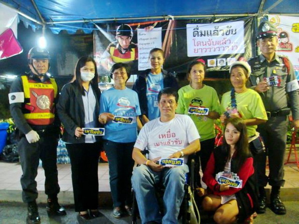 สมาชิกเครือข่ายเหยื่อเมาแล้วขับ จังหวัดชลบุรี รณรงค์เมาไม่ขับ ปีใหม่ตายเป็นศูนย์ ร่วมแจกสื่อ สติ๊กเกอร์ แผ่นพับ ให้ประชาชน บริเวณจุดตรวจสัตหีบ เมื่อวันที่ 30 ธันวาคม พ.ศ.2557 ที่ผ่านมา