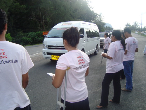 สมาชิกศูนย์ประสานงานเครือข่ายเหยื่อเมาแล้วขับ ในมูลนิธิเมาไม่ขับ จ.พังงา รณรงค์ "เมาไม่ขับ" ปีใหม่ไปให้ถึง ARRIVE ALIVE โดยแจกสื่อ สติ๊กเกอร์ แผ่นพับ ผ้าเย็น ให้กับผู้ใช้รถใช้ถนน ณ สามแยกวังหม้อแกง เมื่อวันที่ 31 ธันวาคม 2553 ที่ผ่านมา