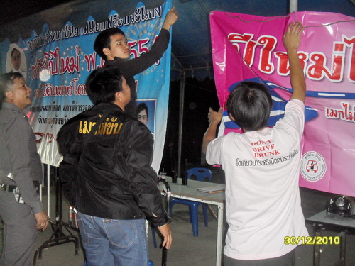 สมาชิกเครือข่ายเหยื่อเมาแล้วขับ ในมูลนิธิเมาไม่ขับ จ.สมุทรปราการ รณรงค์ "เมาไม่ขับ" ปีใหม่ไปให้ถึง ARRIVE ALIVE โดยแจกสื่อ สติ๊กเกอร์ แผ่นพับ ผ้าเย็น ให้กับผู้ใช้รถใช้ถนน ณ จุดตรวจสมุทรปราการ เมื่อวันที่ 31 ธันวาคม 2553 ที่ผ่านมา