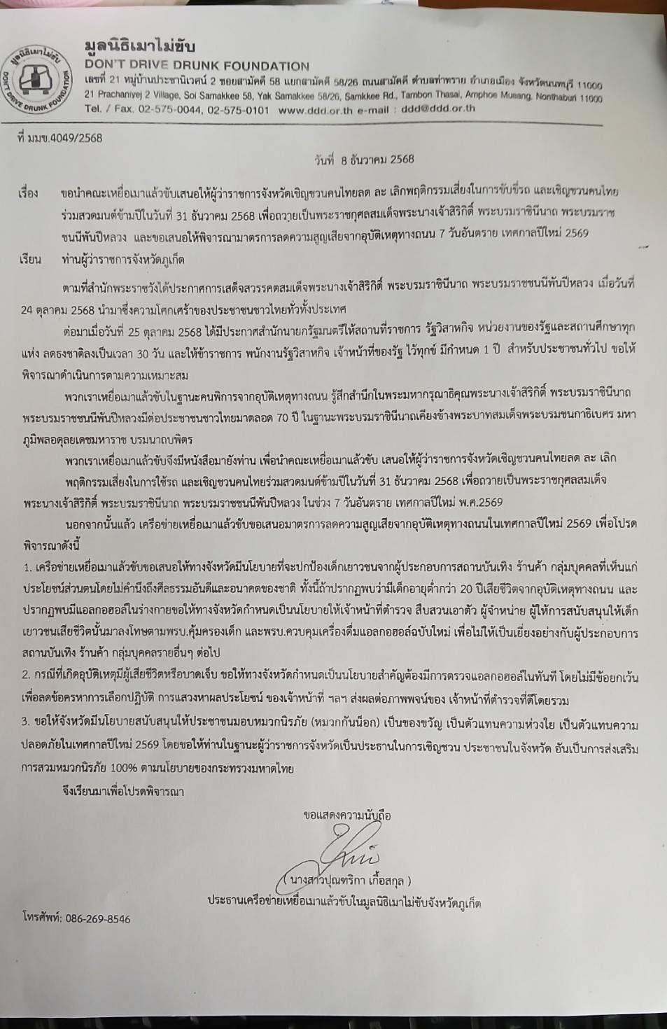 เมื่อวันที่ 9 ธันวาคม พ.ศ.2568 เครือข่ายเหยื่อเมาแล้วขับ ในมูลนิธิเมาไม่ขับ จังหวัดภูเก็ต. พร้อมด้วยทีมงานสมาชิก มายื่นหนังสือให้ท่านผู้ว่าราชการจังหวัดภูเก็ต โดยมีเจ้าหน้าที่รับมอบหนังสือเป็นที่เรียบร้อยแล้ว