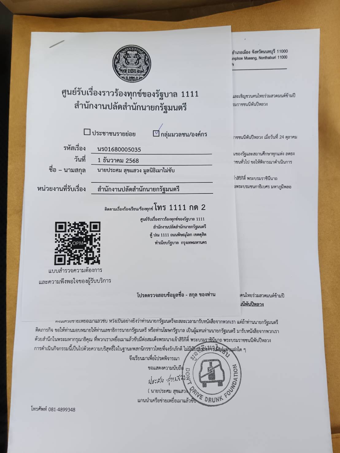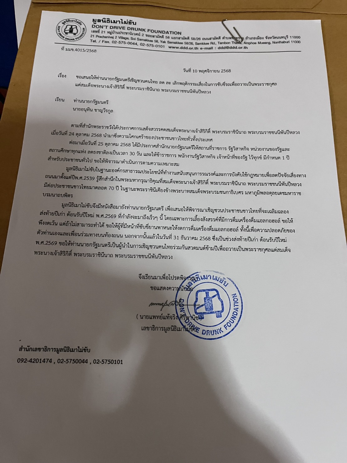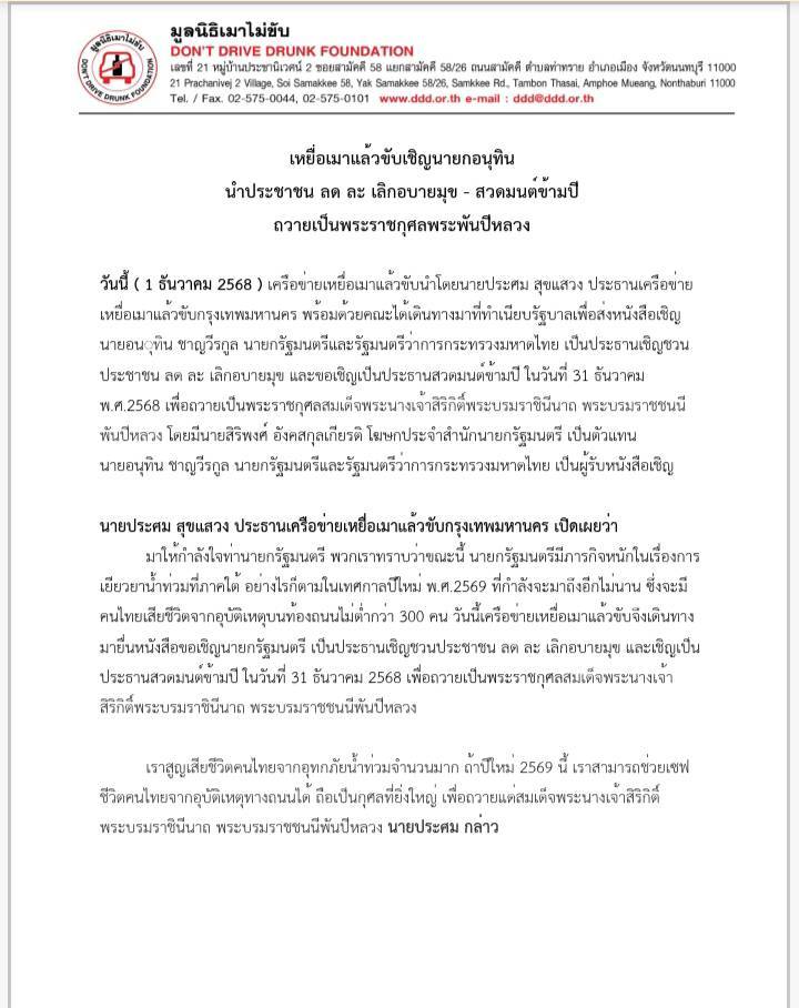 วันนี้ 1 ธันวาคม 2568 เครือข่ายเหยื่อเมาแล้วขับนำโดยนายประศม สุขแสวง ประธานเครือข่ายเหยื่อเมาแล้วขับกรุงเทพมหานคร พร้อมด้วยคณะได้เดินทางมาที่ทำเนียบรัฐบาลเพื่อส่งหนังสือเชิญนายอนุทิน ชาญวีรกูล นายกรัฐมนตรีและรัฐมนตรีว่าการกระทรวงมหาดไทย เป็นประธานเชิญชวนประชาชน ลด ละ เลิกอบายมุข และขอเชิญเป็นประธานสวดมนต์ข้ามปี ในวันที่ 31 ธันวาคม พ.ศ.2568 เพื่อถวายเป็นพระราชกุศลสมเด็จพระนางเจ้าสิริกิติ์พระบรมราชินีนาถ พระบรมราชชนนีพันปีหลวง โดยมีนายสิริพงศ์ อังคสกุลเกียรติ โฆษกประจำสำนักนายกรัฐมนตรี เป็นตัวแทน นายอนุทิน ชาญวีรกูล นายกรัฐมนตรีและรัฐมนตรีว่าการกระทรวงมหาดไทย เป็นผู้รับหนังสือเชิญ นายประศม สุขแสวง ประธานเครือข่ายเหยื่อเมาแล้วขับกรุงเทพมหานคร เปิดเผยว่า มาให้กำลังใจท่านายกรัฐมนตรี พวกเราทราบว่าขณะนี้ นายกรัฐมนตรีมีภารกิจหนักในเรื่องการเยียวยาน้ำท่วมที่ภาคใต้ อย่างไรก็ตามในเทศกาลปีใหม่ พ.ศ.2569 ที่กำลังจะมาถึงอีกไม่นาน ซึ่งจะมีคนไทยเสียชีวิตจากอุบัติเหตุบนท้องถนนไม่ต่ำกว่า 300 คน วันนี้เครือข่ายเหยื่อเมาแล้วขับจึงเดินทางมายื่นหนังสือขอเชิญนายกรัฐมนตรี เป็นประธานเชิญชวนประชาชน ลด ละ เลิกอบายมุข และเชิญเป็นประธานสวดมนต์ข้ามปี ในวันที่ 31 ธันวาคม 2568 เพื่อถวายเป็นพระราชกุศลสมเด็จพระนางเจ้าสิริกิติ์พระบรมราชินีนาถ พระบรมราชชนนีพันปีหลวง เราสูญเสียชีวิตคนไทยจากอุทกภัยน้ำท่วมจำนวนมาก ถ้าปีใหม่ 2569 นี้ เราสามารถช่วยเซฟชีวิตคนไทยจากอุบัติเหตุทางถนนได้ ถือเป็นกุศลที่ยิ่งใหญ่ เพื่อถวายแด่สมเด็จพระนางเจ้าสิริกิติ์พระบรมราชินีนาถ พระบรมราชชนนีพันปีหลวง นายประศม กล่าว