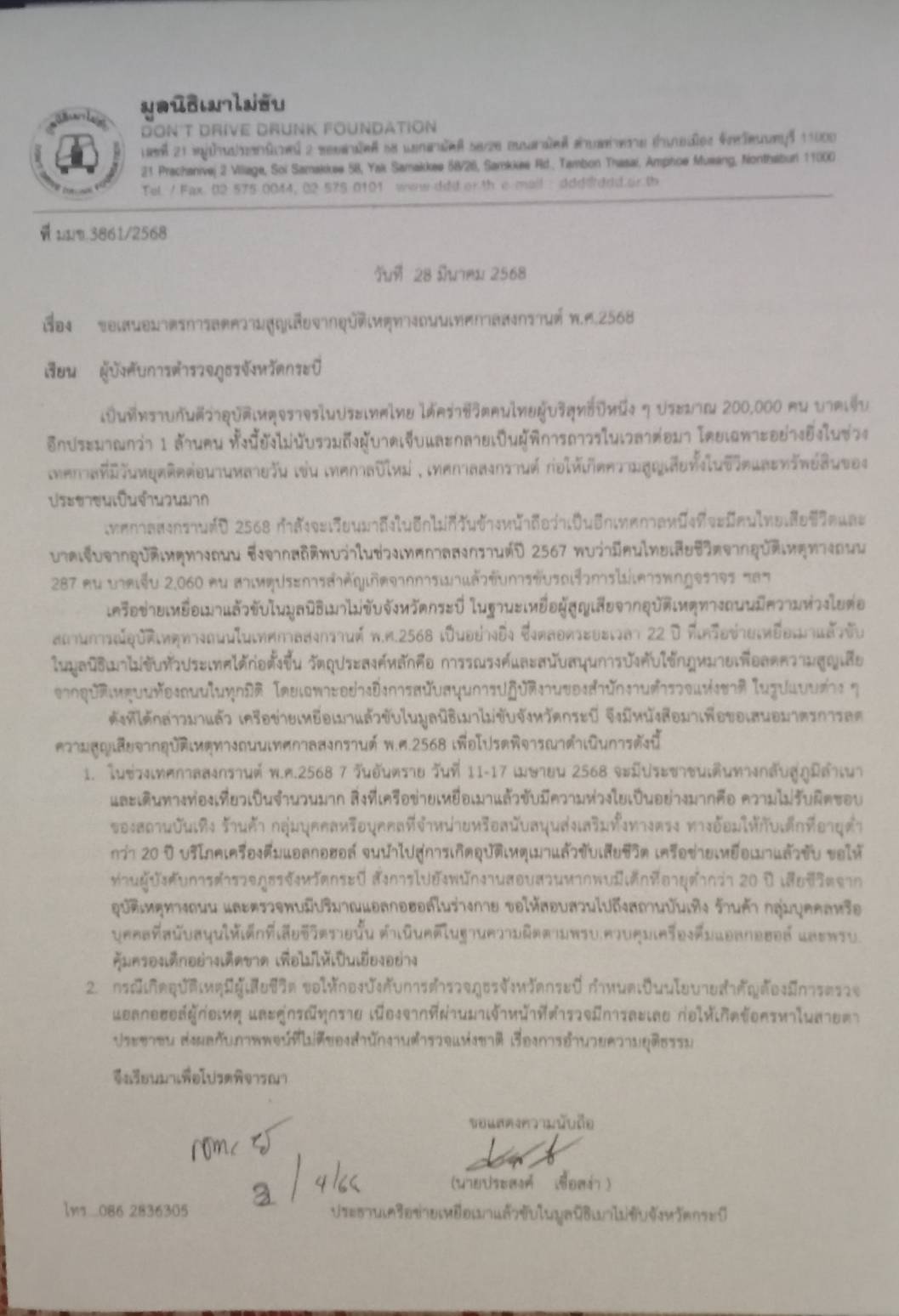 เมื่อวันที่ 3 เมษายน พ.ศ.2568 เครือข่ายเหยื่อเมาแล้วขับ จังหวัดกระบี่ ยื่นหนังสือถึง ผู้บังคับการตำรวจภูธรจังหวัดกระบี่ เพื่อเสนอมาตรการลดความสูญเสียจากอุบัติเหตุทางถนนช่วงเทศกาลสงกรานต์ พ.ศ.2568