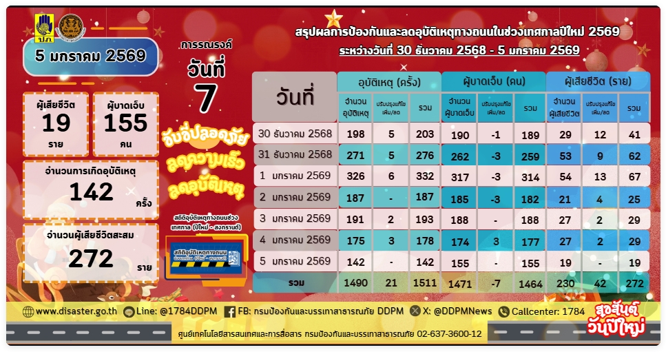 สถิติผู้เสียชีวิตและบาดเจ็บเทศกาลปีใหม่ 2569