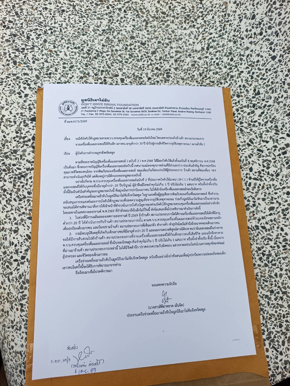 เมื่อวันที่ 6 เมายน พ.ศ.2569 เครือข่ายเหยื่อเมาแล้วขับ จังหวัดสตูล เข้ายื่นหนังสือให้กับผู้บังคับการตำรวจภูธรจังหวัดสตุล ขอให้บังคับใช้กฎหมายตามพ.ร.บ.ควบคุมเครื่องดื่มแอลกอฮอล์ฉบับใหม่ โดยเฉพาะประเด็นร้านค้า สถานประกอบการ ขายเครื่องดื่มแอลกอฮอล์ให้กับเด็ก เยาวชน อายุต่ำกว่า 20 ปี จนนำไปสู่การเสียชีวิตจากอุบัติเหตุทางถนน ( เมาแล้วขับ ) จังหวัด ได้รับเกียรติจาก ร.ตอ.หญิง หนึ่งหทัย ค้างมณีย์ เป็นผู้รับเรื่อง