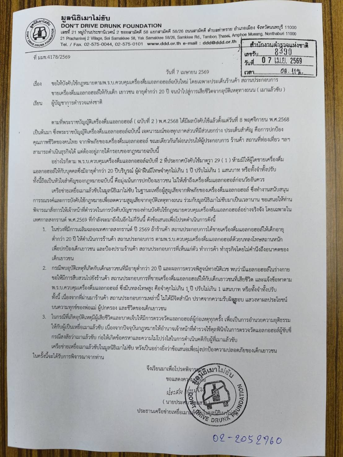 เมื่อวันที่ 7 เมษายน พ.ศ.2569 เครือข่ายเหยื่อเมาแล้วขับ กรุงเทพมหานคร ยื่นหนังสือถึง ผู้บัญชาการตำรวจแห่งชาติ ขอให้บังคับใช้กฎหมายตามพ.ร.บ.ควบคุมเครื่องดื่มแอลกอฮอล์ฉบับใหม่ โดยเฉพาะประเด็นร้านค้า สถานประกอบการ ขายเครื่องดื่มแอลกอฮอล์ให้กับเด็ก เยาวชน อายุต่ำกว่า 20 ปี จนนำไปสู่การเสียชีวิตจากอุบัติเหตุทางถนน ( เมาแล้วขับ )