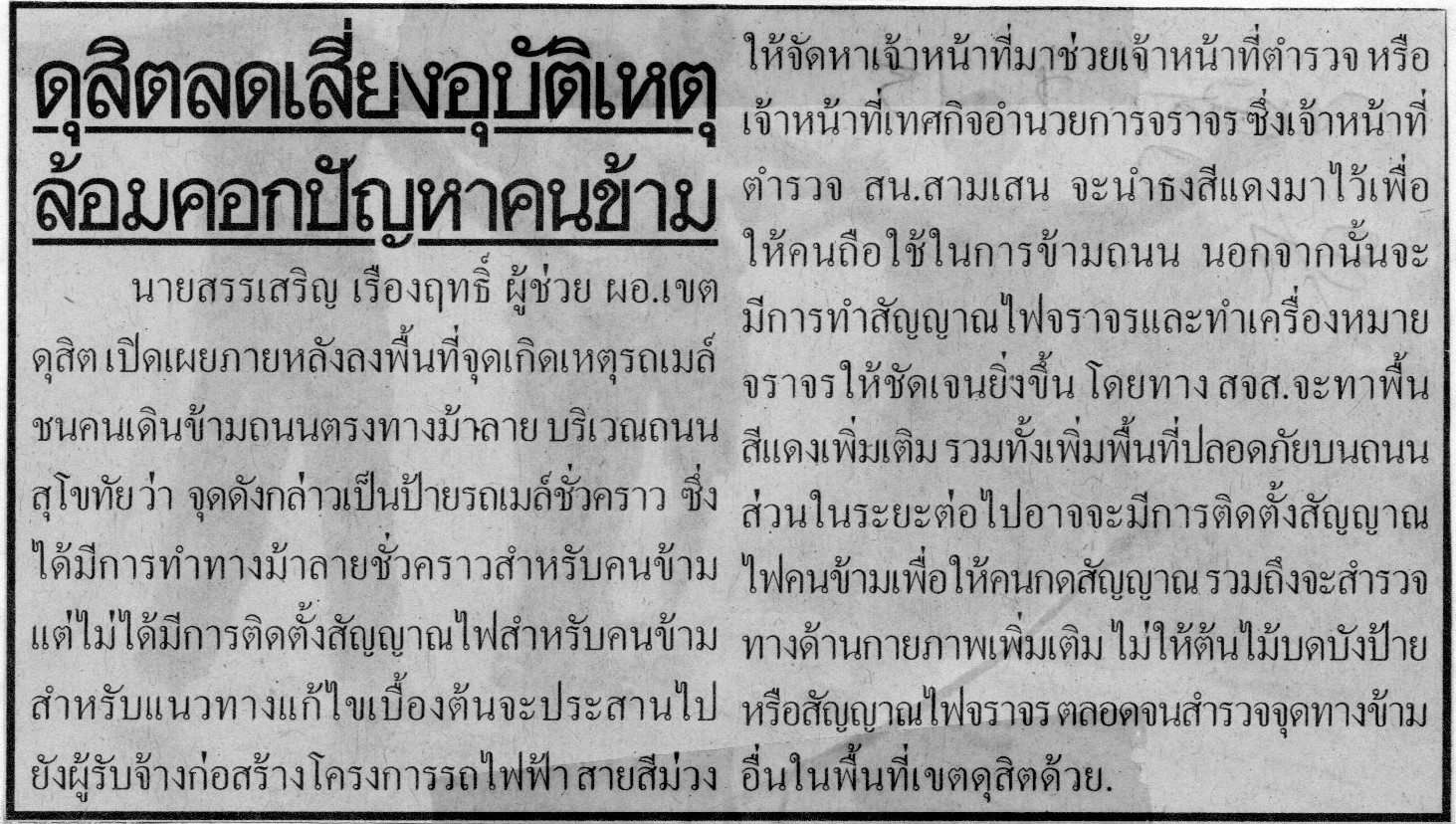 ดุสิตลดเสี่ยงอุบัติเหตุล้อมคอกปัญหาคนข้าม (ไทยรัฐ น15)