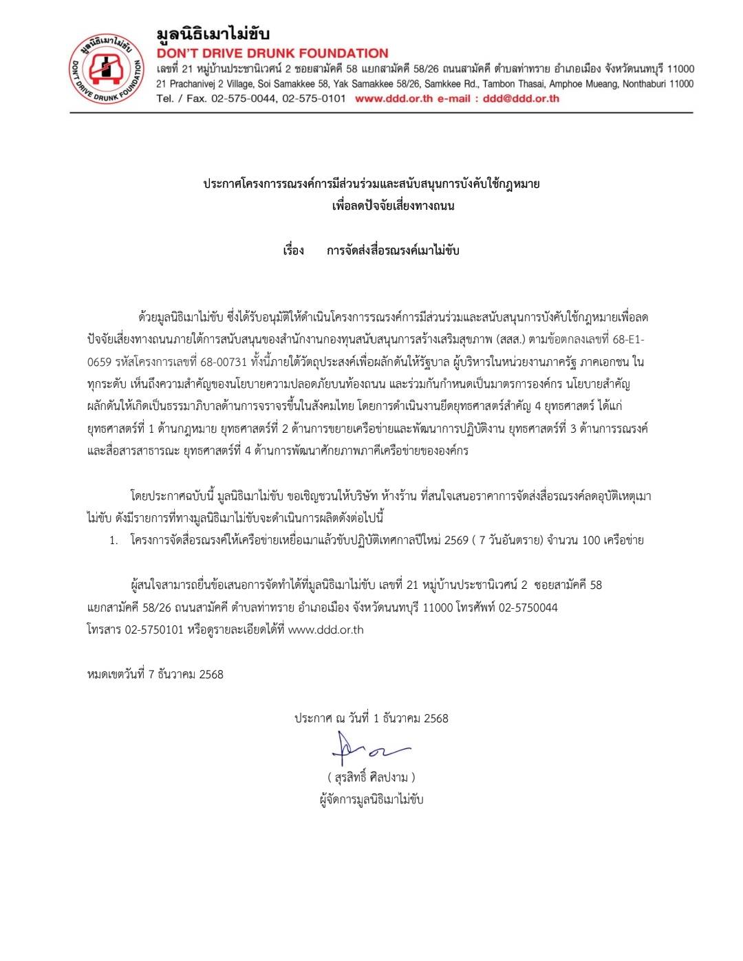ประกาศการจัดส่งสื่อรณรงค์เมาไม่ขับ (1-12-68)