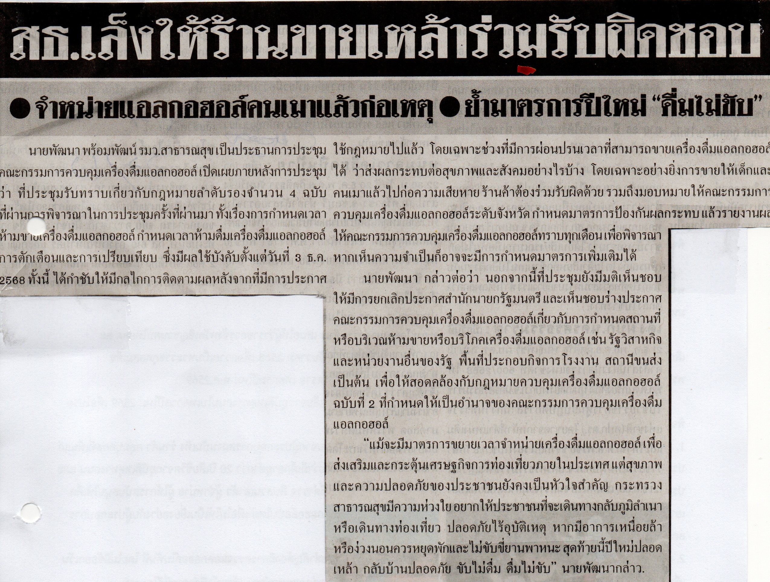 สธ.เล็งให้ร้านขายเหล้าร่วมรับผิดชอบ (ไทยรัฐ น7)