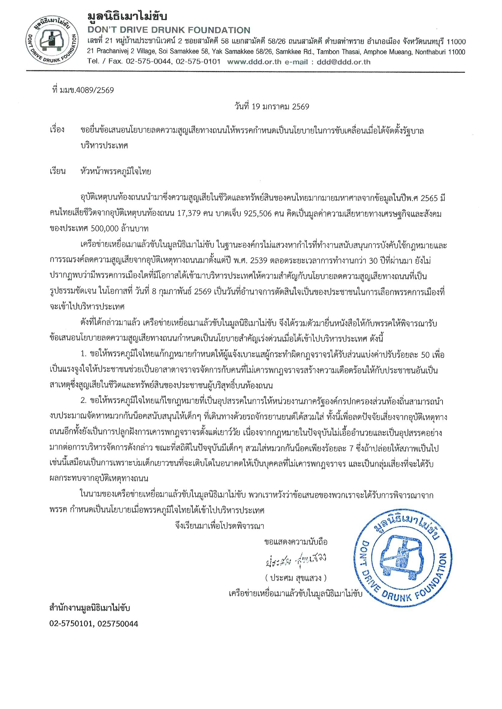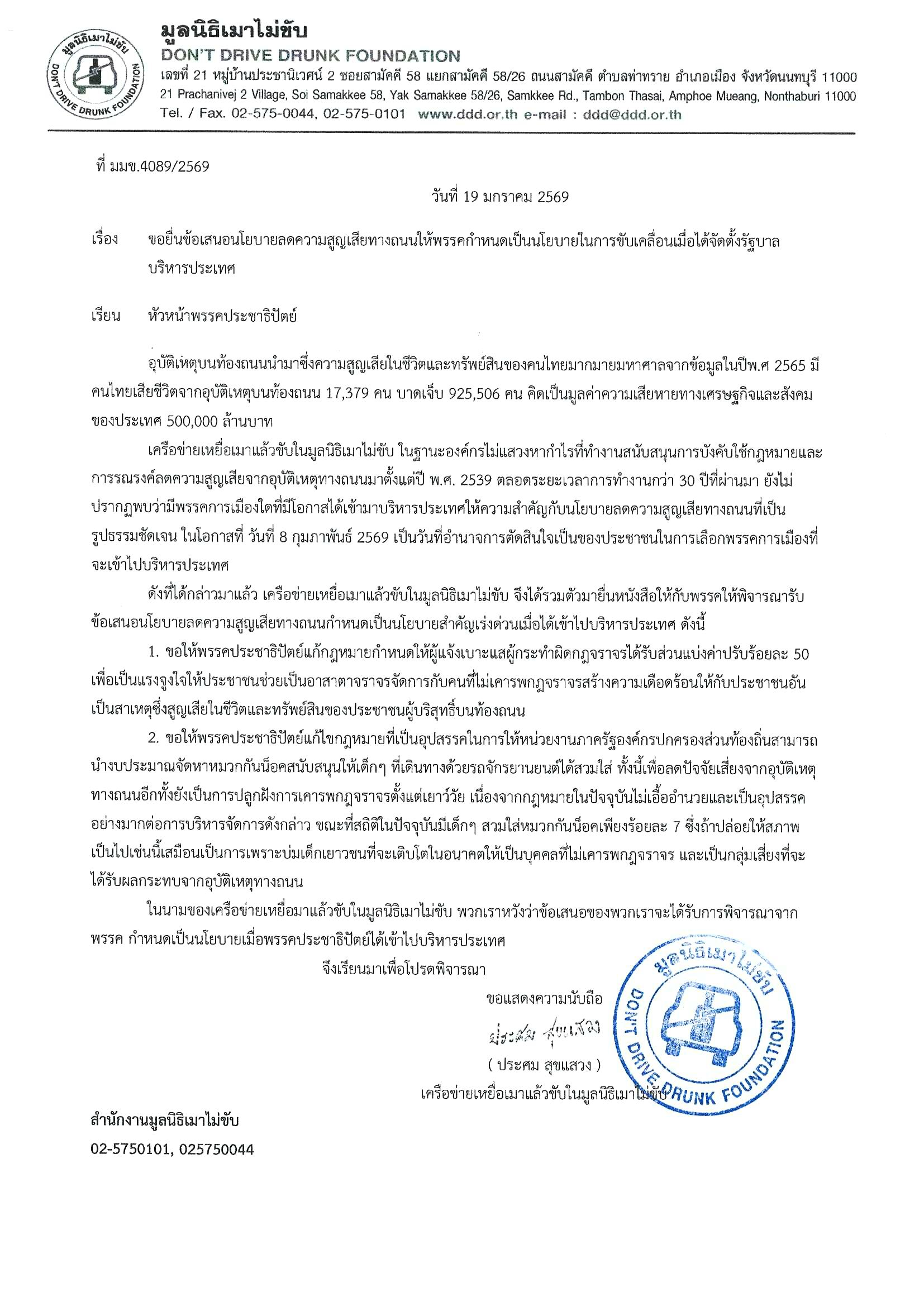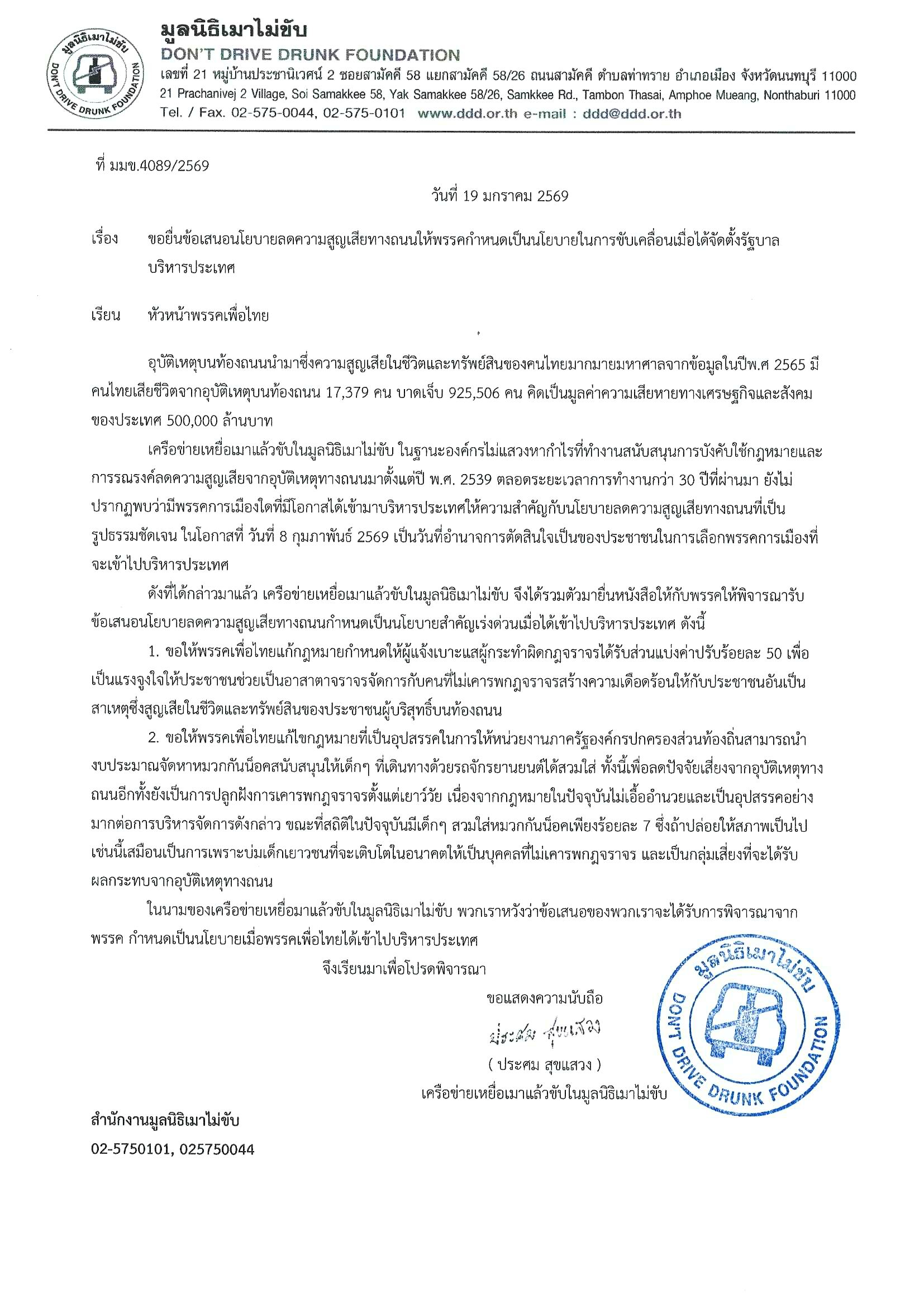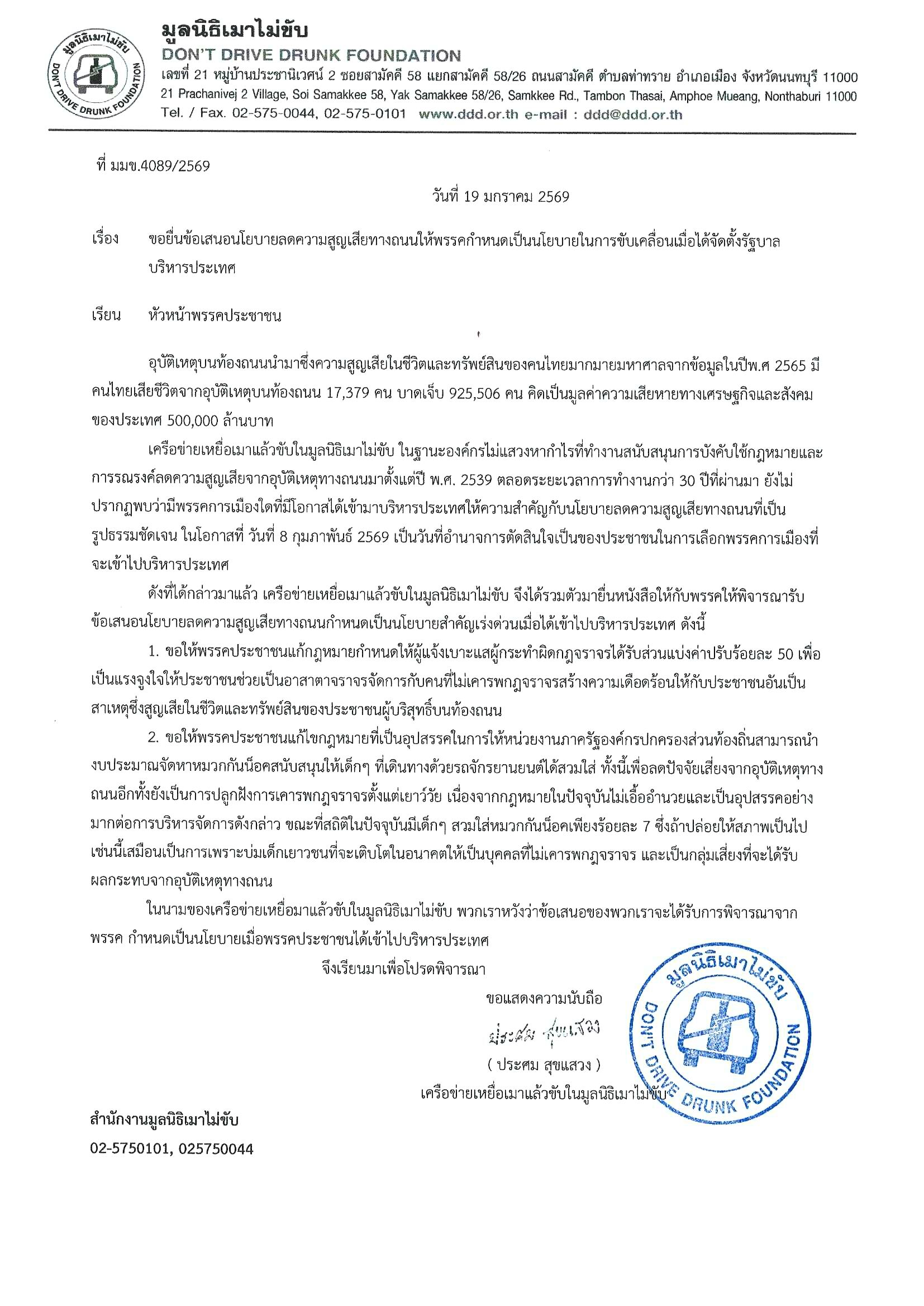 สภาผู้บริโภคร่วมกับ The Reporters จัดเวทีสภาผู้บริโภค พบพรรคการเมือง ดีเบตนโยบาย “ขนส่งไร้รอยต่อกรุงเทพ อนาคตที่คุณเลือกได้” : ใครทำได้จริง โดย เครือข่ายเหยื่อเมาแล้วขับ กรุงเทพมหานคร ร่วมรับฟัง การนำเสนอนโยบายจากพรรคการเมือง ได้แก่ พรรคเพื่อไทย พรรคประชาชน พรรคภูมิใจไทย และพรรคประชาธิปัตย์ และยื่อข้อเสนอนโยบายลดอุบัติเหตุทางถนน เมื่อพรรคการเมืองได้รับการจัดตั้งเป็นรัฐบาลบริหารประเทศต่อไป ณ ห้องปะชุม The One Balloon ชั้น 4 โรงแรมไอบิส สไตล์ กรุงเทพฯ รัชดา เวลา 09.30-12.00 น. เมื่อวันที่ 23 มกราคม 2569 ที่ผ่านมา