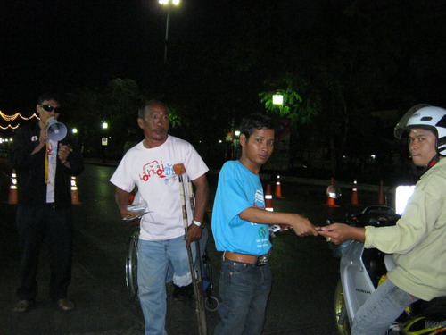 สมาชิกศูนย์ประสานงานเครือข่ายเหยื่อเมาแล้วขับ ในมูลนิธิเมาไม่ขับ จ.นครราชสีมา รณรงค์ "เมาไม่ขับ" เทศกาลสงกรานต์ 2553 แจกสื่อ สติ๊กเกอร์ แผ่นพับ ให้กับประชาชน ณ จุดตรวจหน้าโรงแรมคาเธย์ ในวันที่ 12 เมษายน 2553 ที่ผ่านมา