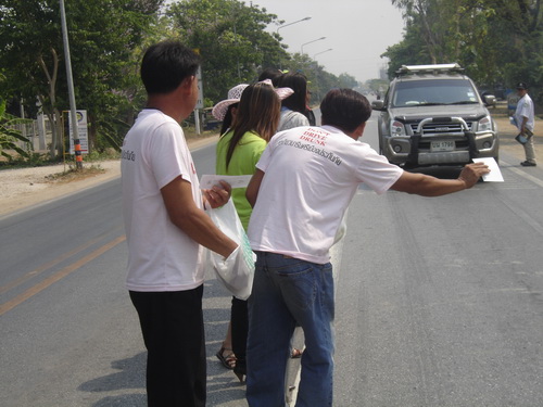 สมาชิกเครือข่ายเหยื่อเมาแล้วขับ ในมูลนิธิเมาไม่ขับ จ.ลำพูน รณรงค์ "เมาไม่ขับ" เทศกาลสงกรานต์ 2553 แจกสื่อ สติ๊กเกอร์ แผ่นพับ ให้กับประชาชน ณ จุดตรวจหน้า อบต.ป่าสัก ในวันที่ 12 เมษายน 2553 ที่ผ่านมา