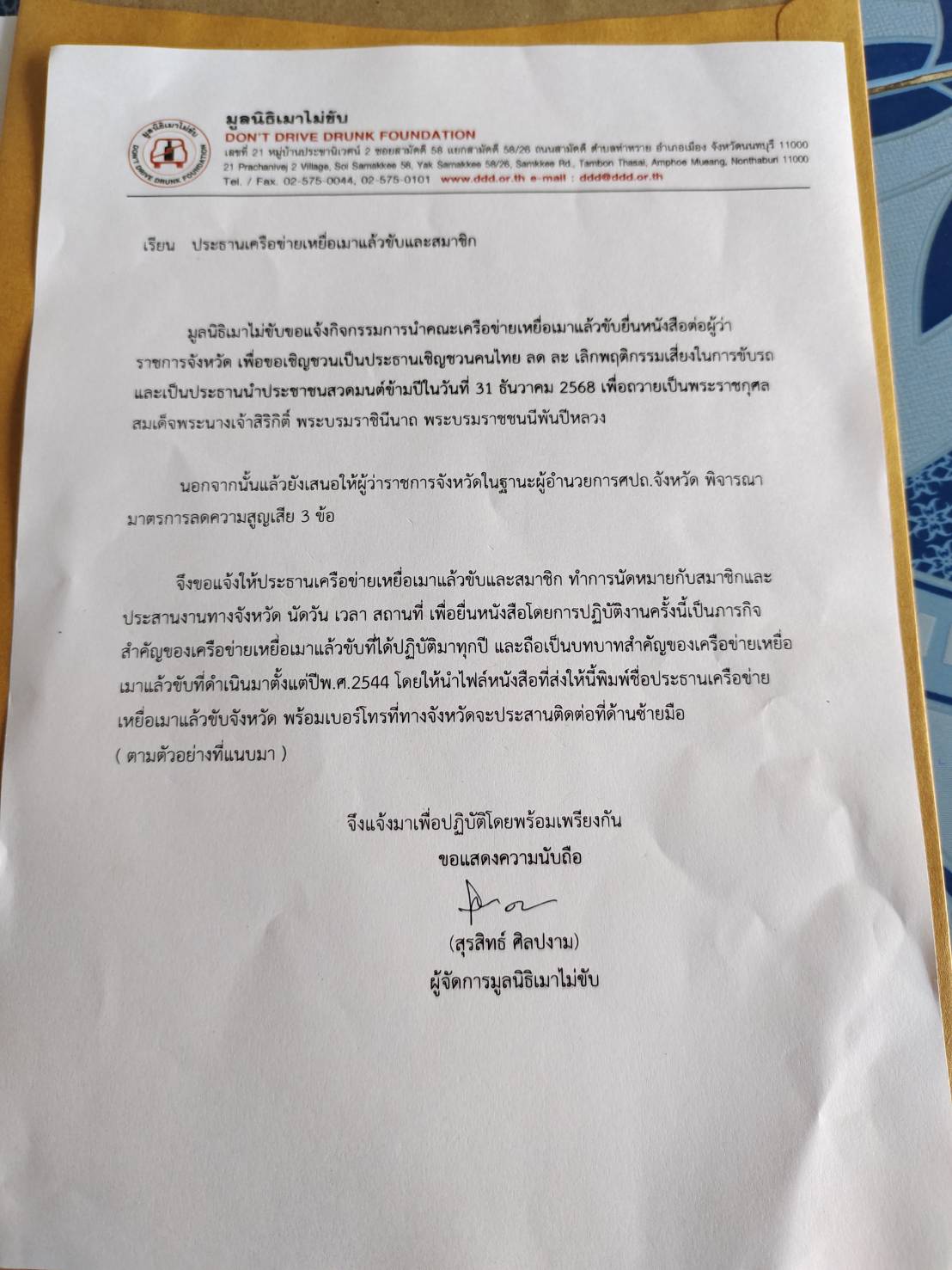พวเราเหยื่อเมาแล้วขับจึงมีหนังสือมายังท่าน เพื่อนำคณะเหยื่อเมาแล้วขับ เสนอให้ผู้ว่าราชการจังหวัดเชิญชวนคนไทยลด ละ