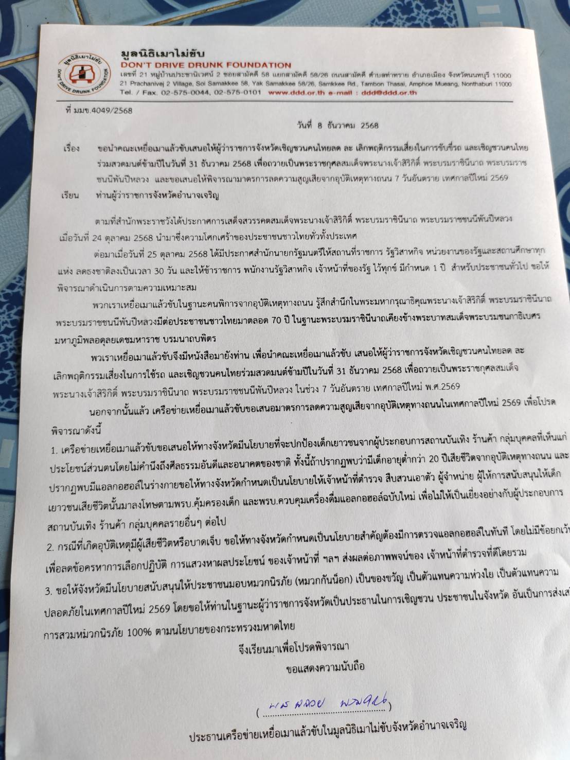 เรื่อง ขอนำคณะเหยื่อเมาแล้วขับเสนอให้ผู้ว่าราชการจังหวัดเชิญชวนคนไทยลด ละ เลิกพฤติกรรมเสี่ยงในการขับขี่รถ และเชิญชวนคนไทย