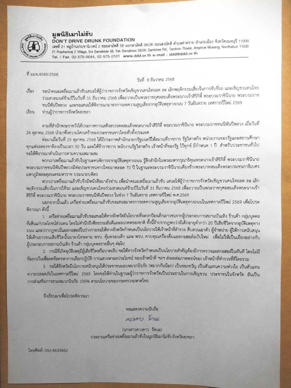 เมื่อวันที่ 11 ธันวาคม พ.ศ.2568 เครือข่ายเหยื่อเมาแล้วขับ จังหวัดสงขลา ได้มายื่นหนังสือให้ท่านผู้ว่าราชการจังหวัดสงขลา โดยมีเจ้าหน้าที่รับมอบหนังสือเป็นที่เรียบร้อยแล้ว