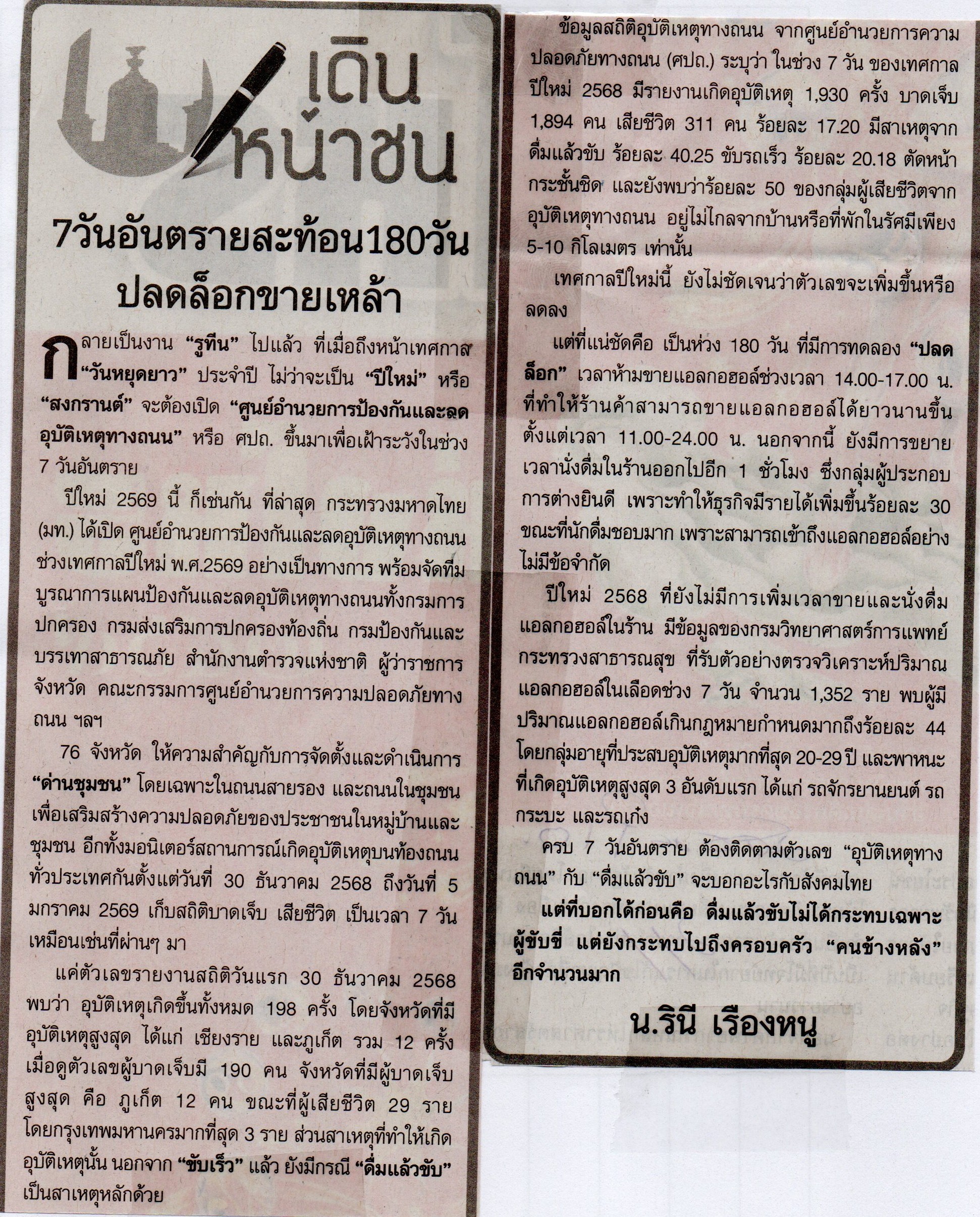 7วันอันตรายสะท้อน180วันปลอดล็อกขายเหล้า (ไทยรัฐ น10)