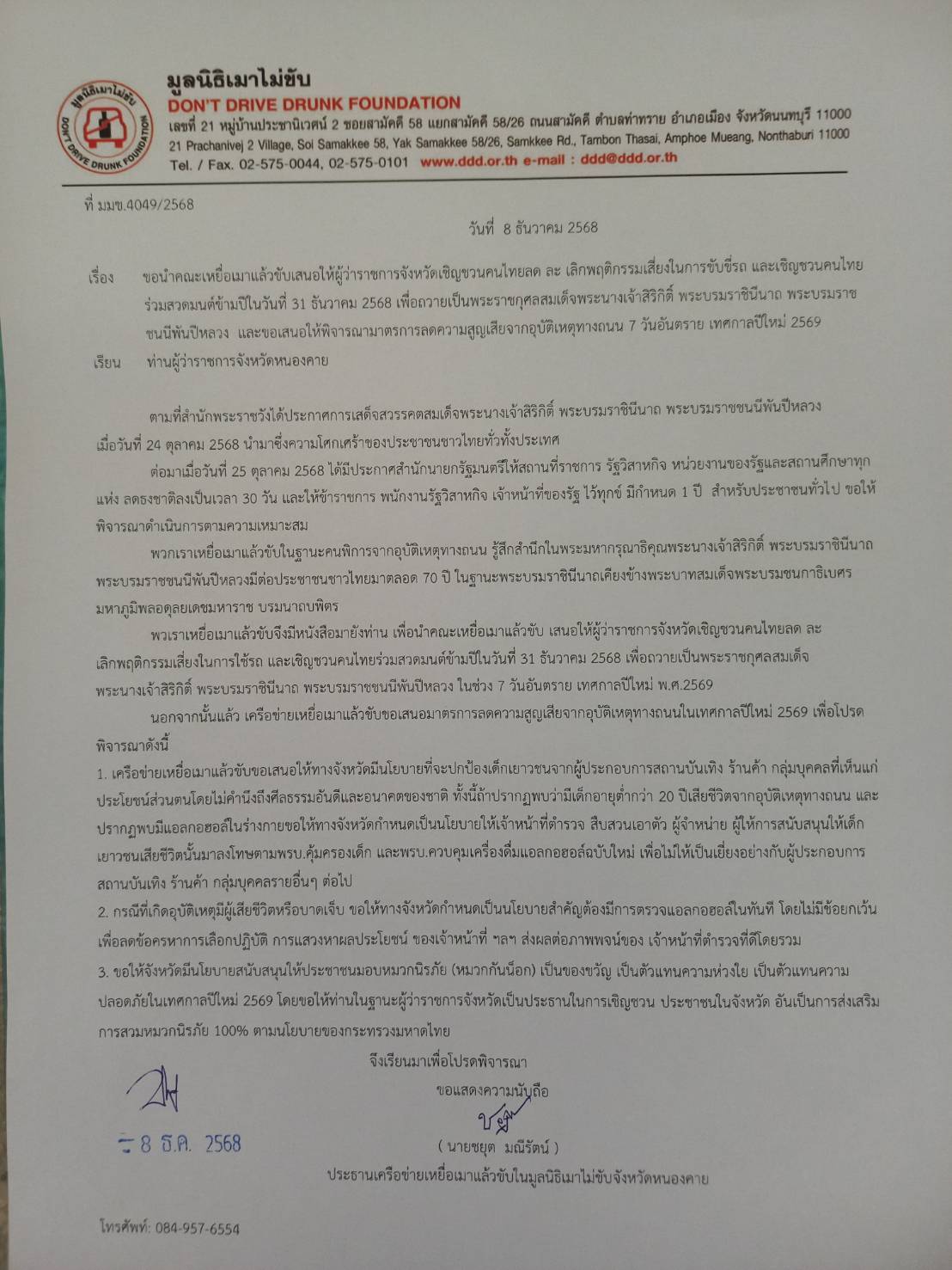 เครือข่ายเหยื่อเมาแล้วขับ ในมูลนิธิเมาไม่ขับ จังหวัดหนองคาย ได้เข้ายื่นหนังสือให้กับท่านผู้ว่าราชการจังหวัด เชิญชวนคนไทยลด ละ เลิกพฤติกรรมเสี่ยงในการขับขี่รถ และเชิญชวนคนไทยร่วมสวดมนต์ข้ามปีในวันที่ 31 ธันวาคม 2568 เพื่อถวายเป็นพระราชกุศลสมเด็จพระนางเจ้าสิริกิติ์ พระบรมราชินีนาถ พระบรมราชชนนีพันปีหลวง และขอเสนอให้พิจารณามาตรการลดความสูญเสียจากอุบัติเหตุทางถนน 7 วันอันตราย เทศกาลปีใหม่ 2569 เมื่อวันที่ 8 ธันวาคม พ.ศ.2568 ที่ผ่านมา
