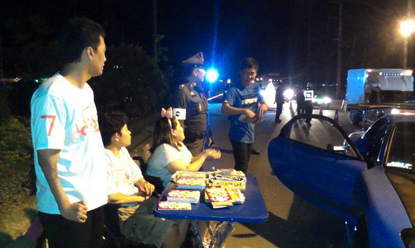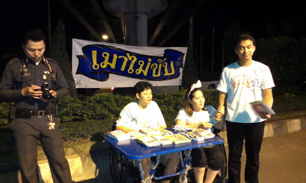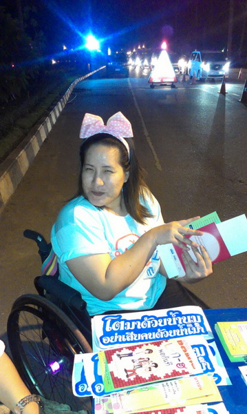 สมาชิกศูนย์ประสานงานเครือข่ายเหยื่อเมาแล้วขับ ในมูลนิธิเมาไม่ขับ กรุงเทพมหานคร รณรงค์ เมาไม่ขับ แจกสื่อสติ๊กเกอร์ แผ่นพับ มห้ประชาชน ณ จุดตรวจลำผักชี เมื่อวันที่ 20 กรกฎาคม 2555 ที่ผ่านมา