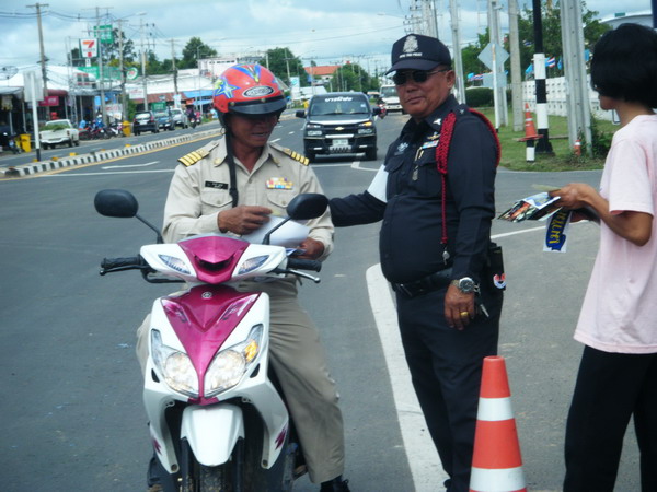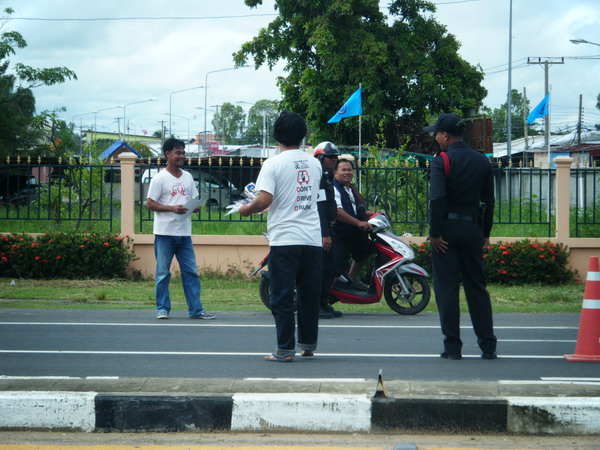 สมาชิกศูนย์ประสานงานเครือข่ายเหยื่อเมาแล้วขับ ในมูลนิธิเมาไม่ขับ จ.สุรินทร์ รณรงค์เมาไม่ขับ แจกสื่อสติ๊กเกอร์ แผ่นพับ ณ จุดตรวจ สภ.ชุมพลบุรี เมื่อวันที่ 18 สิงหาคม 2555 ที่ผ่านมา
