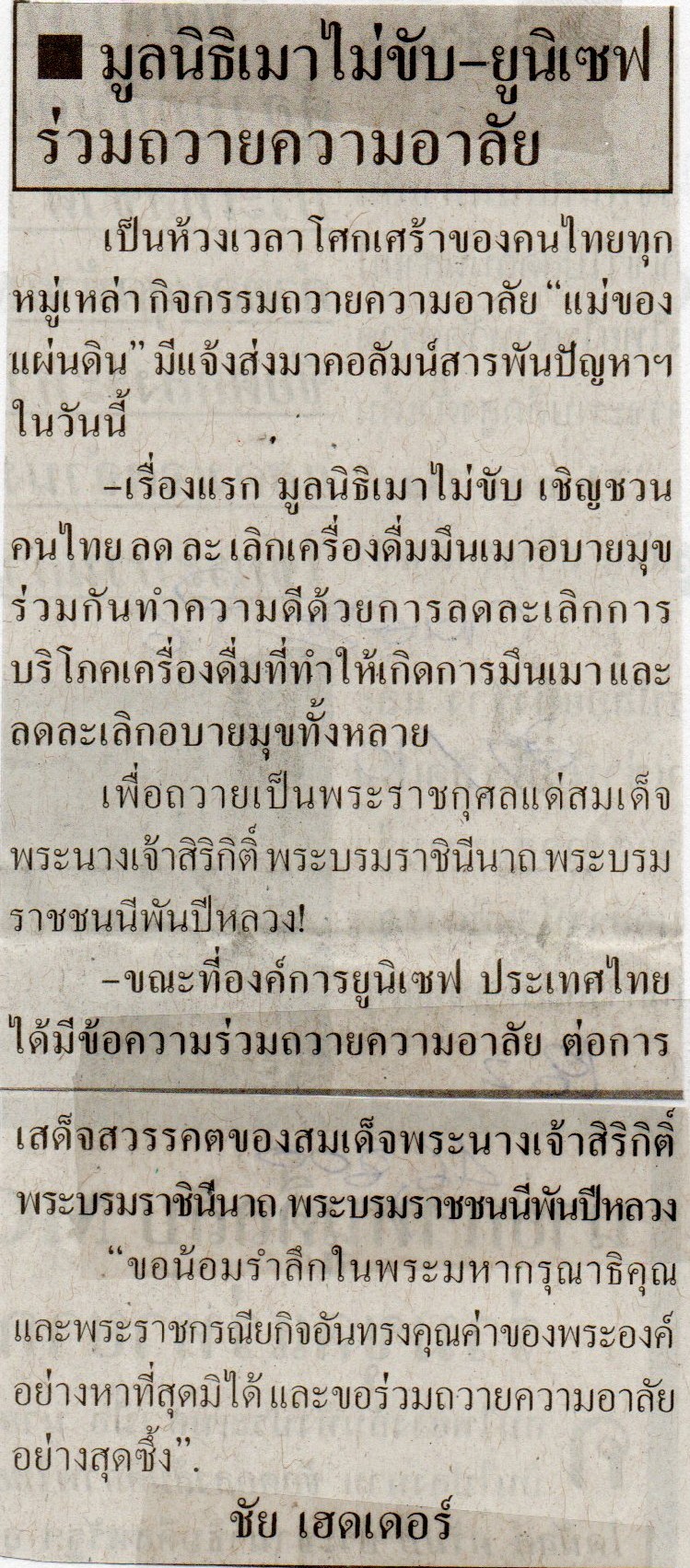 มูลนิธิเ้มาไม่ขับ-ยูนิเซฟร่วมถวายความอาลัย (ไทยรัฐ น6)
