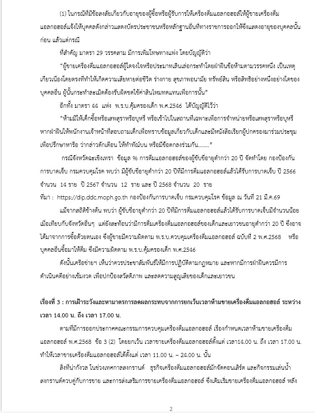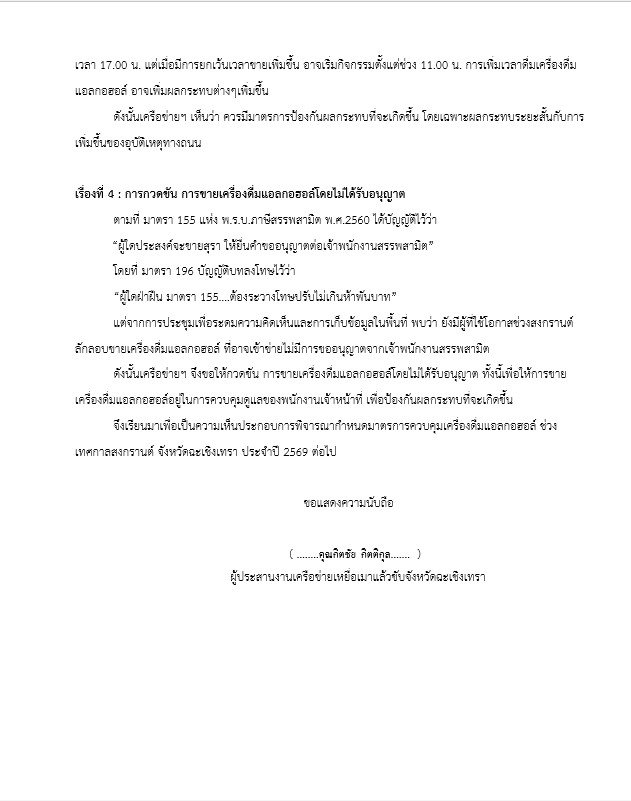 เมื่อวันที่ 1 เมษายน พ.ศ.2569 เวลา 08.30 น. สมาคมองค์กรงดเหล้า ร่วมกับ เครือข่ายเหยื่อเมาแล้วขับ ใน มูลนิธิเมาไม่ขับ จังหวัดฉะเชิงเทรา และสมาชิก ร่วมยื่นหนังสือถึงผู้ว่าราชการจังหวัดฉะเชิงเทรา ผ่านท่านนายฤกษ์ฤทธิ์ บุญยัง ดำรงตำแหน่งผู้อำนวยการกลุ่มงานศูนย์ดำรงธรรมจังหวัดฉะเชิงเทรา (ผอ.ศูนย์ดำรงธรรมจังหวัดฉะเชิงเทรา) เพื่อเสนอข้อพิจารณาทางนโยบายเชิงกฎหมายต่อการควบคุมเครื่องดื่มแอลกอฮอล์ ช่วงเทศกาลสงกรานต์ จังหวัดฉะเชิงเทรา ประจำปี 2569
